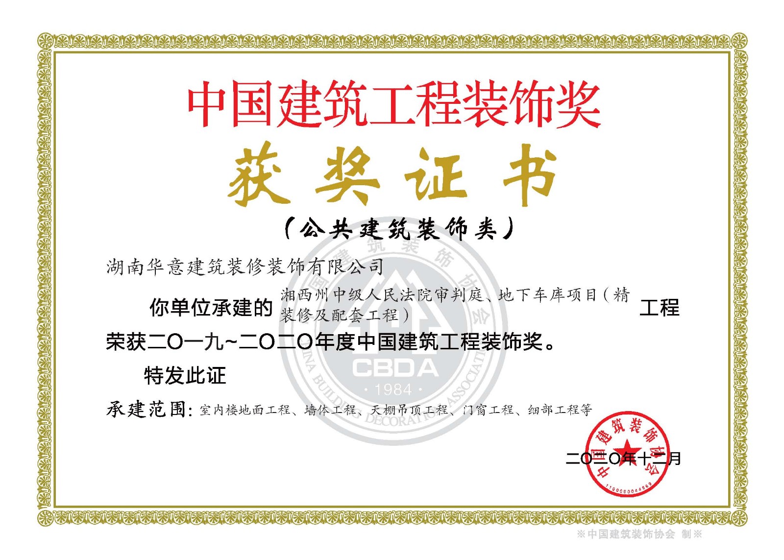 裝飾獎--湘西州中級人民法院審判庭、地下車庫項目(精裝修及配套工程)
